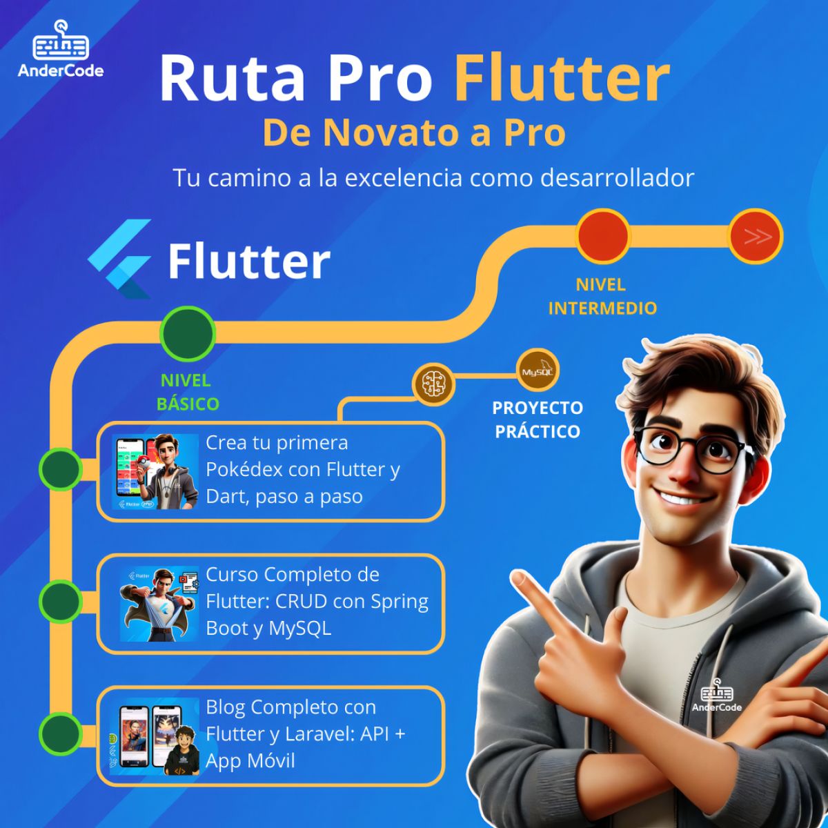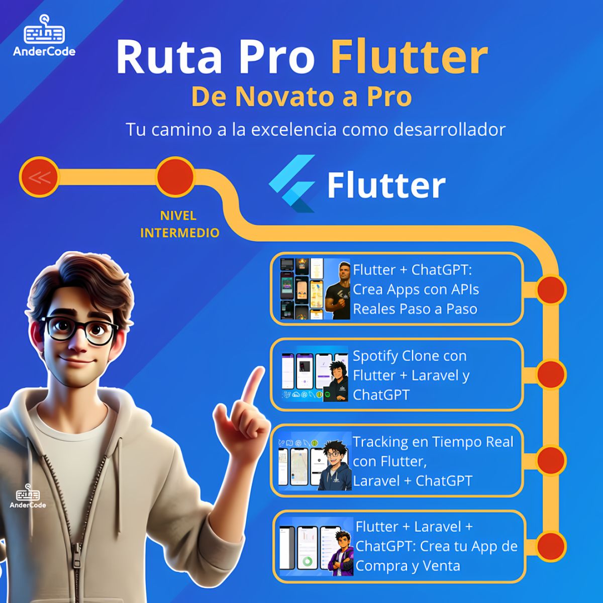 Por eso nace la Ruta Pro Flutter: De Novato a Pro, una estructura actualizada con proyectos reales que te llevan desde tu primera app móvil hasta sistemas avanzados listos para producción.