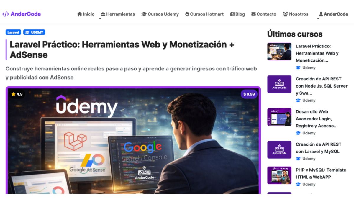 En este curso aprenderás a desarrollar herramientas online funcionales desde cero, utilizando Laravel y JavaScript, y a convertirlas en proyectos con potencial real de monetización mediante tráfico web y Google AdSense.